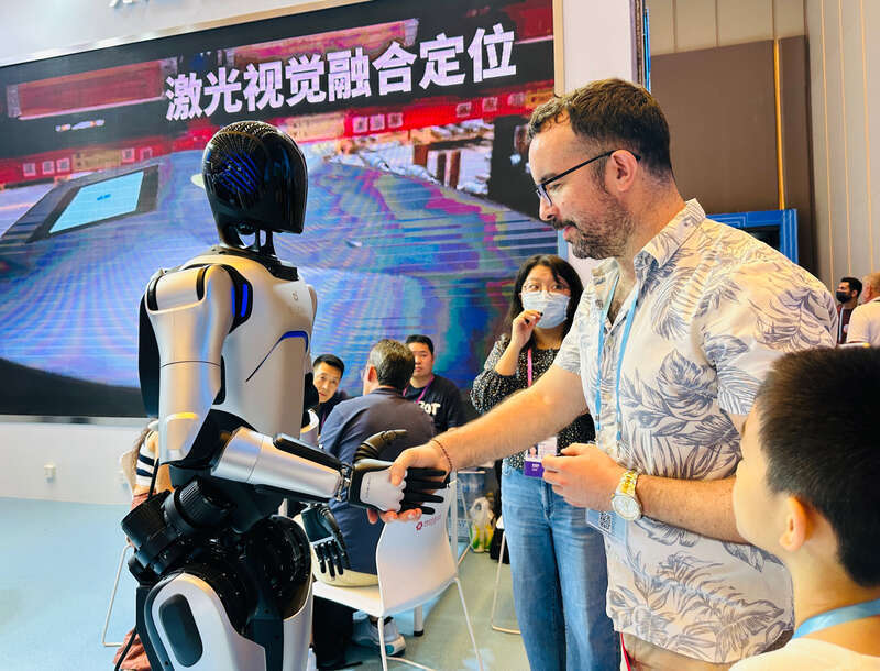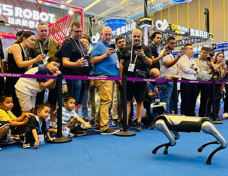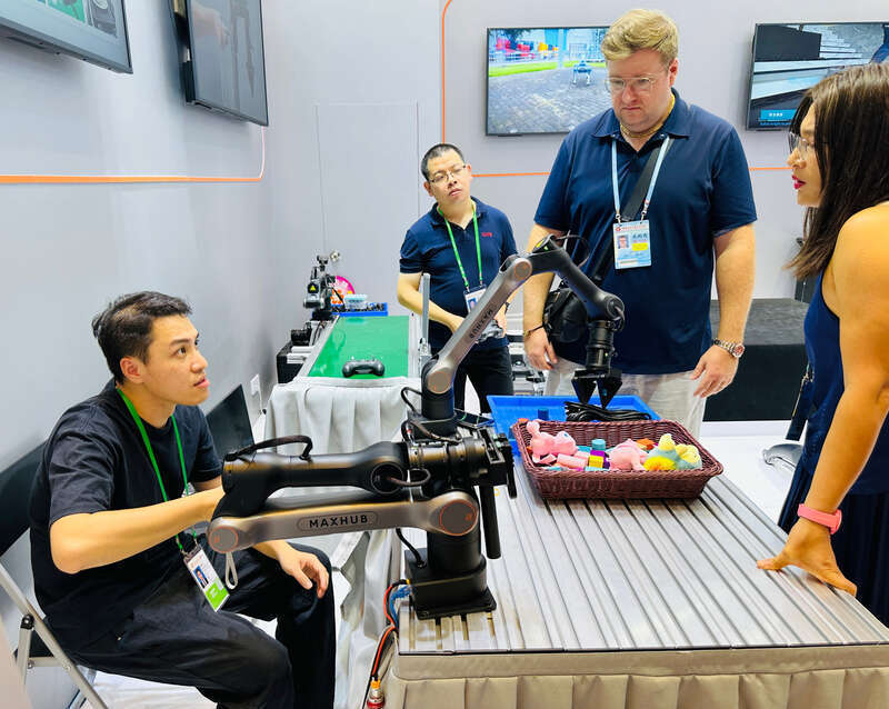 首次进驻服务机器人展区的视源股份掌牛宝,带来在世界机器人大会上获奖的MAXHUB X7工业级四足机器人,以及可完成穿针、搭积木等高精度动作的智能柔性机械臂,吸引众多境外客商现场互动体验。